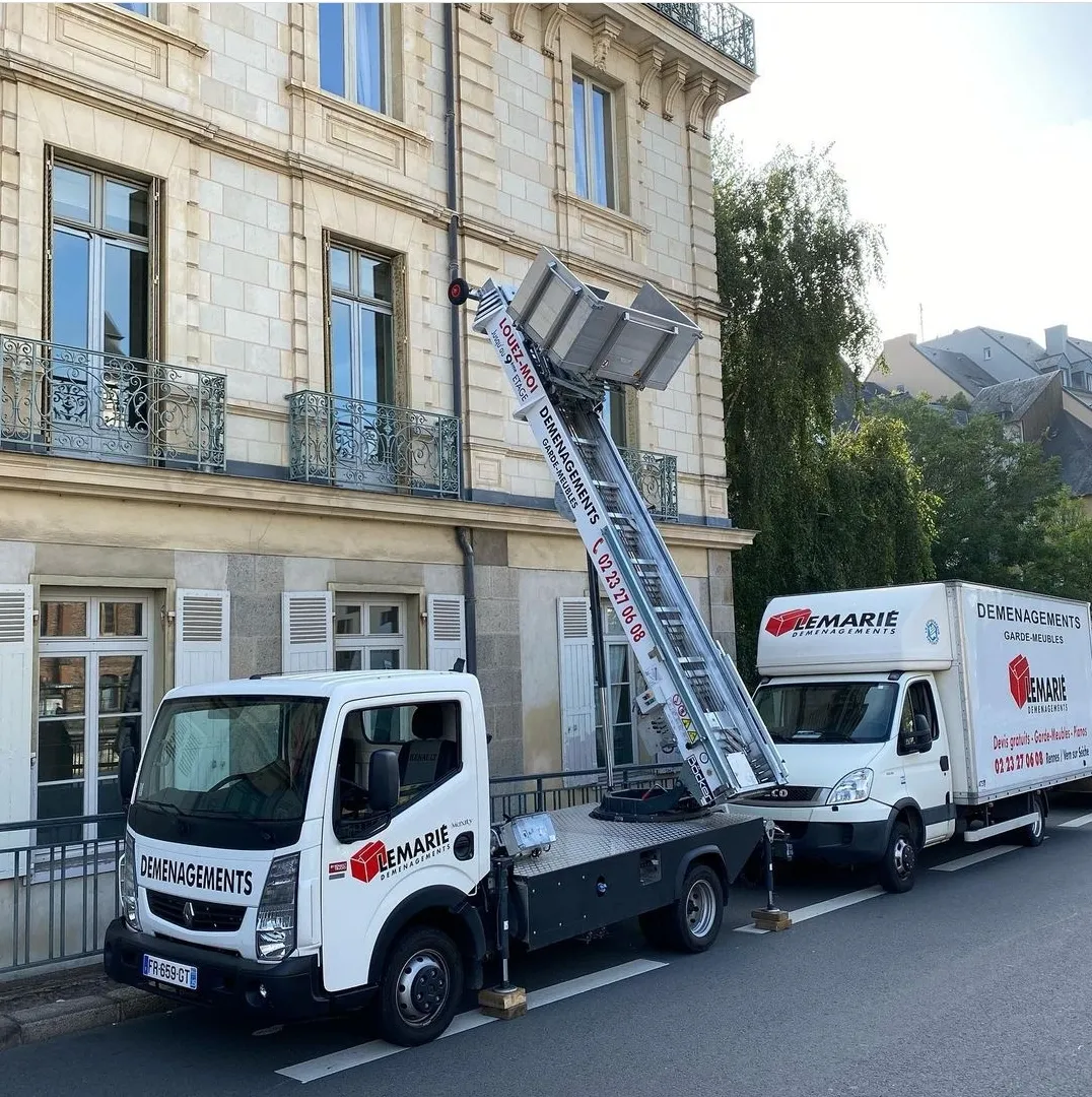 LEMARIÉ DÉMÉNAGEMENTS met à disposition un monte-meuble autoporté sur camion, utilisable jusqu’à 9 étages, avec opérateur qualifié pour une manipulation précise et sécurisée. Disponible à l’heure, à la demi-journée ou à la journée, ce service permet de gagner du temps, de limiter les efforts et de sécuriser le transport de votre mobilier.