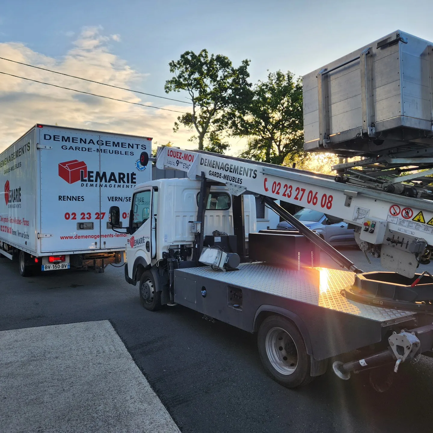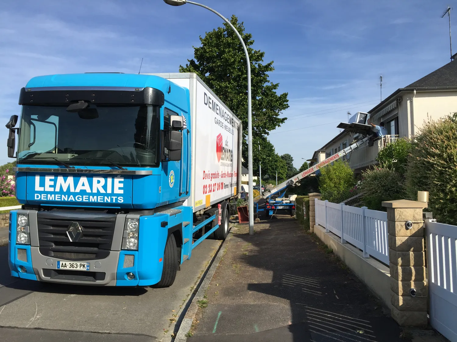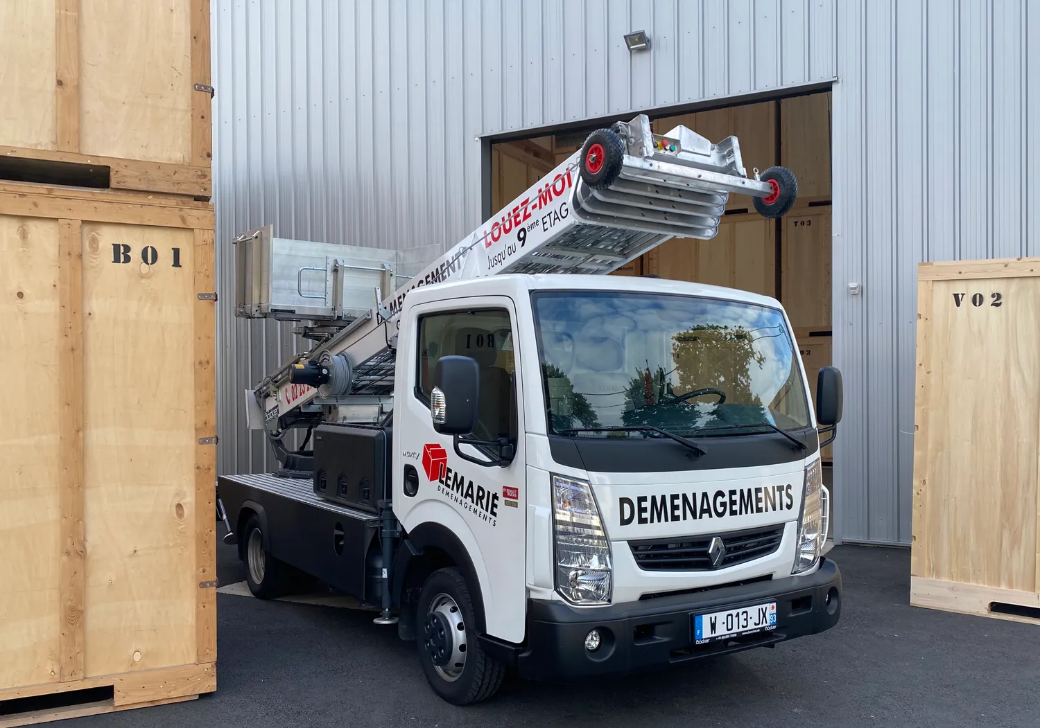 LEMARIÉ DÉMÉNAGEMENTS met à disposition un monte-meuble autoporté sur camion, utilisable jusqu’à 9 étages, avec opérateur qualifié pour une manipulation précise et sécurisée. Disponible à l’heure, à la demi-journée ou à la journée, ce service permet de gagner du temps, de limiter les efforts et de sécuriser le transport de votre mobilier.